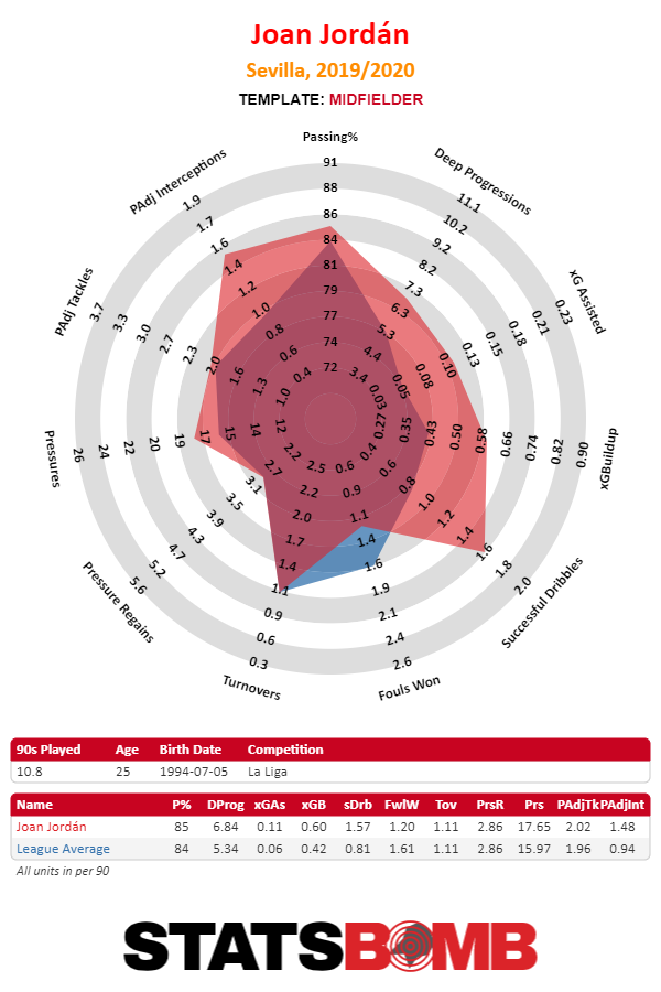 Jordán could play in any midfield in Europe at this point and at 25, still has a chance to. On the flipside, if Sevilla keep improving and manage to keep hold of him, they win as well. His pace adjusted interceptions, tackles and pressures are above league average for his position and he also operates with plenty of attacking flair. Depending on his role, Jordán can do whatever is asked of him.
