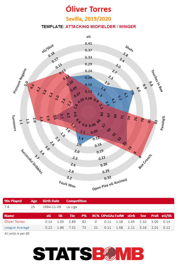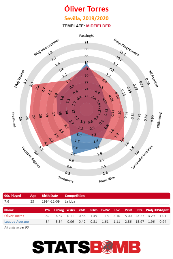 For attacking midfielders who have played at least 600 minutes, only Lionel Messi and Eden Hazard have more deep progressions. His 47.45 carries per 90 is also behind just the two. One area where Torres fell down was his willingness to sacrifice for Simeone. Under Lopetegui, he leads all players in his position with 600 minutes with 23.27 pressures and 5 pressure regains per 90 minutes. His 27.87 aggressive actions per 90 is also the best. We haven’t really seen Torres in all his attacking glory yet, but after five months at Sevilla he's shown his willingness to work hard and flashes of his exceptional link up play.